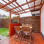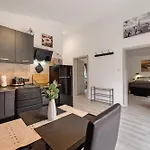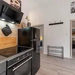 器具でいっぱいの台所と街路景色を眺めることができます. そして1の浴室があります.
